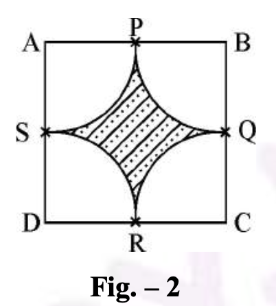 If , where 2A is an acute angle, find the value of A. - Find the area of the shaded region in Fig. 2, where arcs drawn with centres A, B, C and D intersect in pairs at mid-points P, Q, R and S of the sides AB, BC, CD and DA respectively of a square ABCD of side 12 cm. [Use = 3.14]